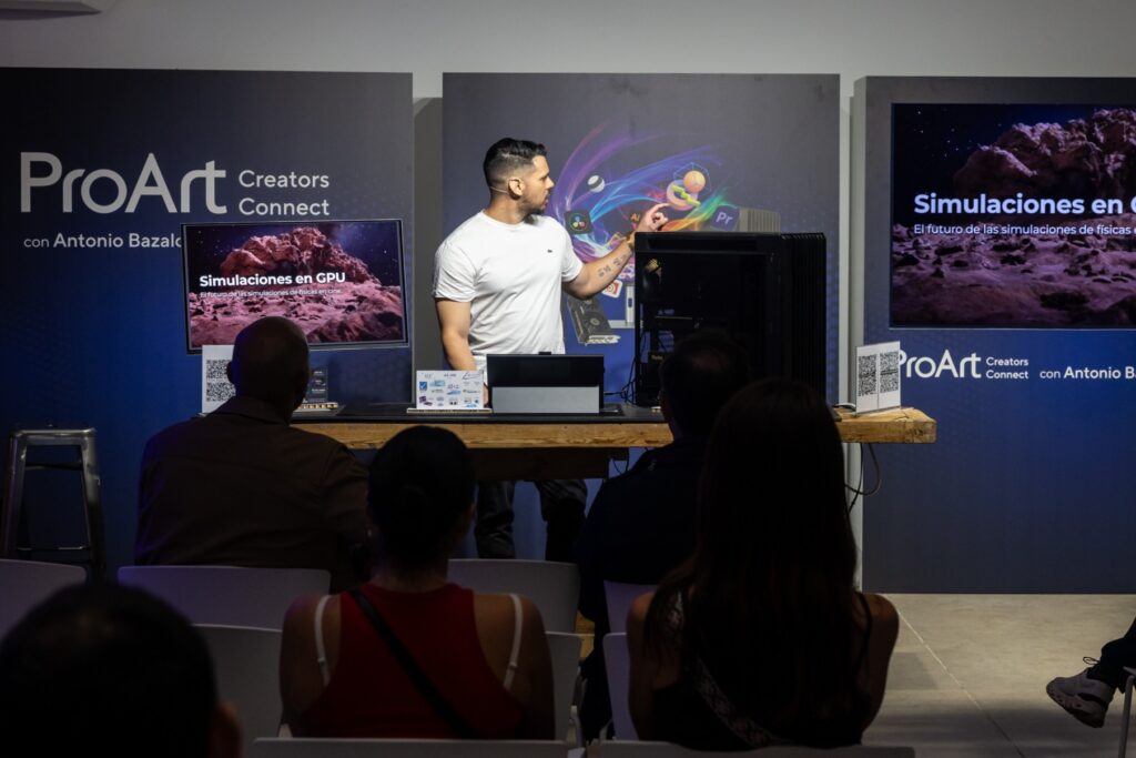 En esa misma línea, la programación se estructuró en dos demostraciones. Por un lado, Héctor Gallego —conocido por su divulgación de VFX y su canal “Esperando el render”— desplegó flujos de simulación de físicas con Houdini apoyados por GPU, subrayando por qué la elección de la arquitectura de la máquina ya no es un detalle técnico sino un factor creativo. Gallego trabajó con referencias de series como Shōgun o Juego de tronos para explicar cómo se combinan texturas y fuerzas en CGI y por qué un cuello de botella puede sabotear un plano antes de nacer. «El ecosistema ProArt, y especialmente monitores como el ASUS ProArt OLED PA32UCDM, permiten a los profesionales de los efectos especiales trabajar con una mayor precisión en los detalles», explicó, apuntando a especificaciones que en la práctica marcan diferencias: panel OLED 4K de 31,5 pulgadas y refresco de 240 Hz. La parte “invisible” (placa base ProArt X870E Creator WiFi, gráfica ProArt GeForce RTX 5080 OC) se tradujo en tiempos de cálculo sostenidos y en iteraciones más rápidas; la visible, en un control fino de sombras y microcontrastes al previsualizar.