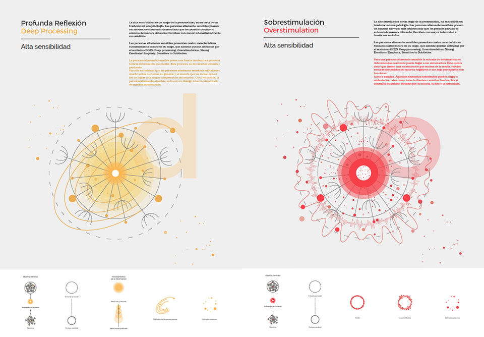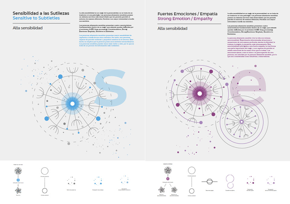 Para ello, Raquel ha creado una serie de carteles que describen los cuatro pilares fundamentales que presentan las personas altamente sensibles, conocidas con el acrónimo en inglés DOES (Deep Processing, Overstimulation, strong Emotions/Emphaty, Sensitive to Subleties). La creación de estos carteles tiene el propósito de dar visibilidad a esta situación mediante el impacto visual, informativo y divulgativo a través de diversos medios. Además, estos carteles están complementados por un libro que amplia la información sobre la alta sensibilidad.
