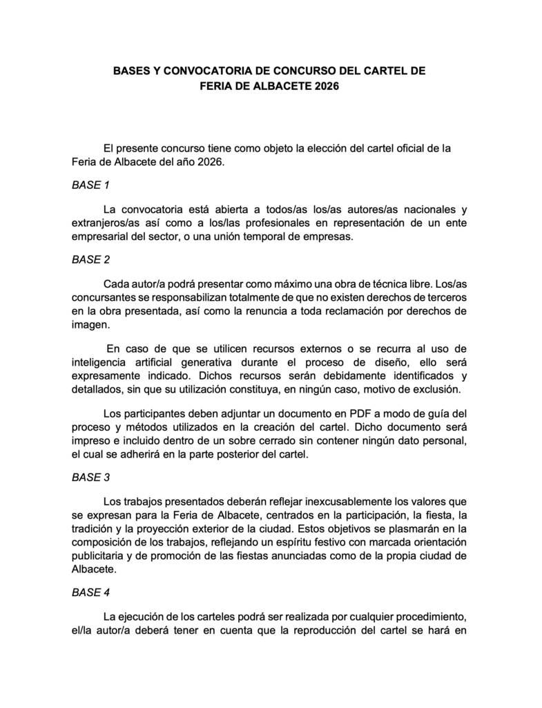 El Ayuntamiento de Albacete ha publicado las bases del concurso para elegir el cartel oficial de la Feria 2026. Aunque el texto detalla un sistema de premios que otorga 4.000 euros al ganador y pequeñas cantidades a los cuatro finalistas (600, 400, 300 y 200 euros), la realidad es que todos los participantes deben asumir por su cuenta los gastos de producción, impresión, tipografía y envío. Un planteamiento que reproduce, una vez más, el modelo de concurso especulativo que tantas veces se ha criticado en el ámbito del diseño.