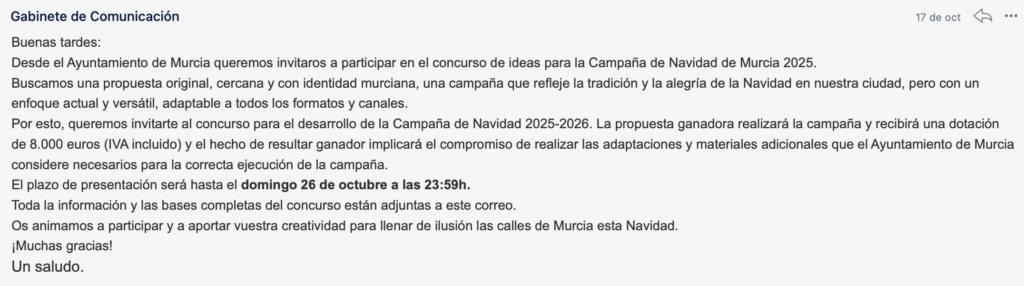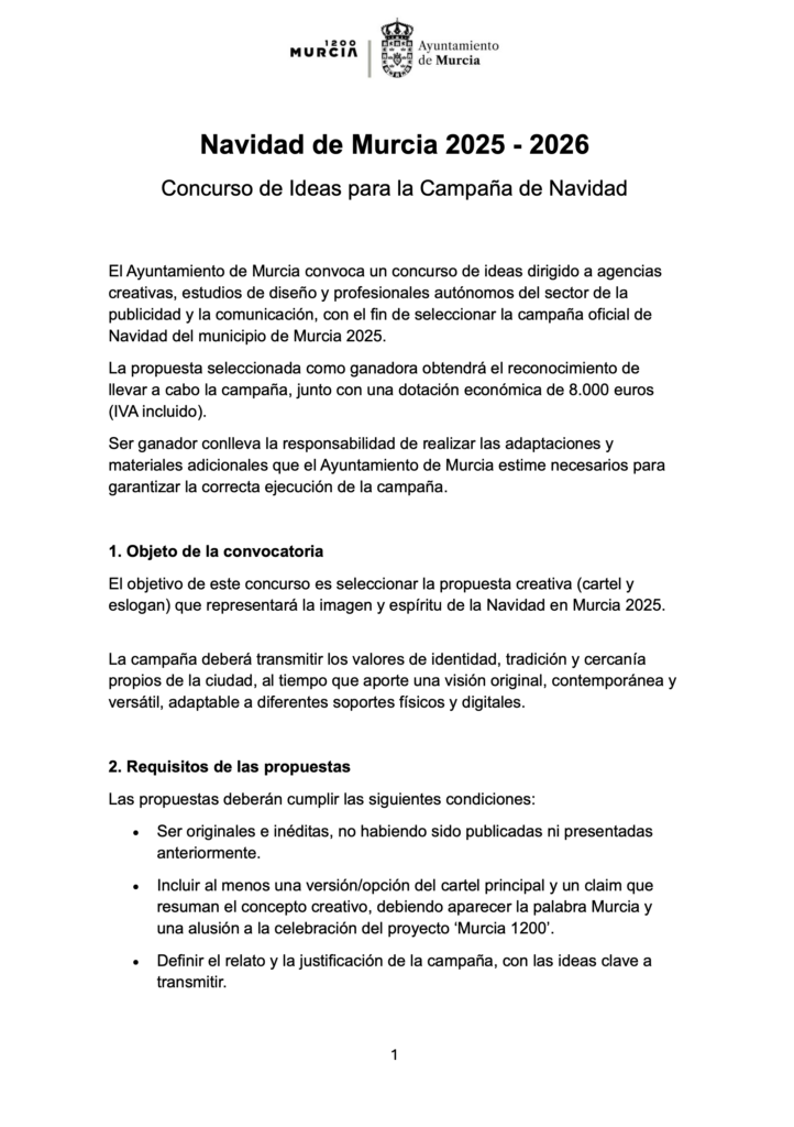 El concurso, dirigido a agencias, estudios y profesionales autónomos, enviada por el Gabinete de Comunicación del ayuntamiento de forma indiscriminada por correo electrónico, solicita la creación de una campaña integral que deberá reflejar la identidad y las tradiciones murcianas, incluir referencias al aniversario “Murcia 1200” y transmitir un mensaje “emotivo y contemporáneo”. Sin embargo, pese a su amplitud, la convocatoria establece una dotación única de 8.000 euros (IVA incluido), que engloba tanto la cesión total de derechos como la producción de todas las adaptaciones necesarias.