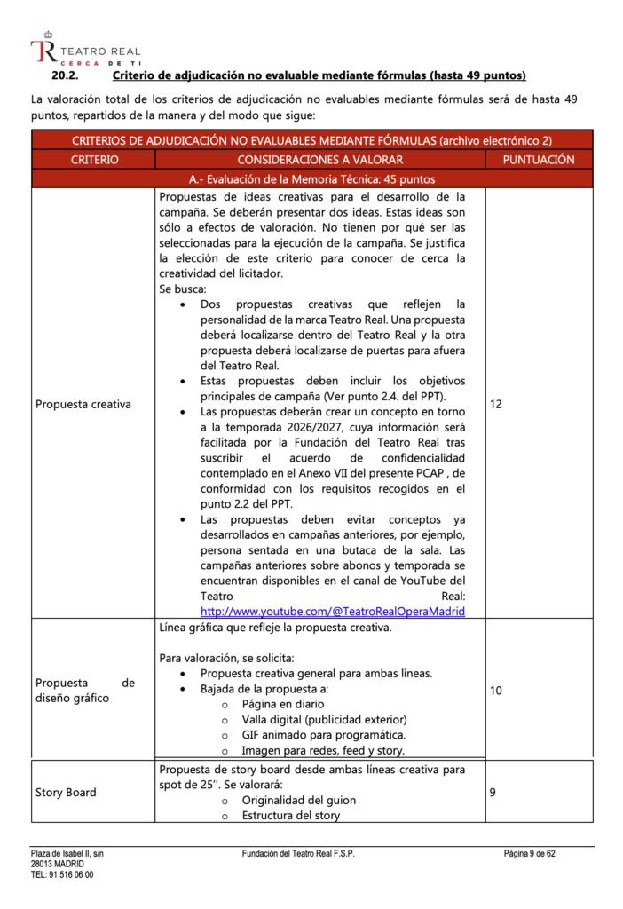 La Fundación del Teatro Real ha publicado una licitación pública para la realización de la campaña de temporada y abonos 2026/2027 en la que exige a las agencias y estudios participantes la presentación de dos propuestas creativas completas, el desarrollo de una línea gráfica y el planteamiento narrativo de un spot audiovisual, todo ello antes de la adjudicación del contrato. El presupuesto base de la licitación es de 29.500 euros (sin IVA) y el criterio económico representa el 51 % de la puntuación total.