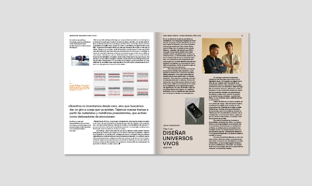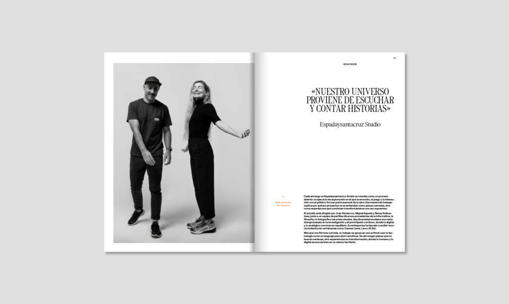 El bloque de entrevistas amplía esa mirada a través de diferentes disciplinas y generaciones. Isidro Ferrer reivindica lo analógico como un territorio aún fértil, ajeno a la nostalgia. Knom habla del oficio de encontrar lo mejor, incluso cuando el camino exige paciencia. Brandfy reflexiona sobre cómo la inteligencia artificial puede ayudar a los creativos a ser más rentables sin perder criterio. Vasava comparte su experiencia acumulada y la importancia de aprovechar lo aprendido. Espadaysantacruz explora la escucha como punto de partida del diseño. Y estudios como Silencio, Cuchillo o Supperstudio muestran cómo la colaboración, el proceso y la experimentación siguen siendo los verdaderos motores de la innovación.