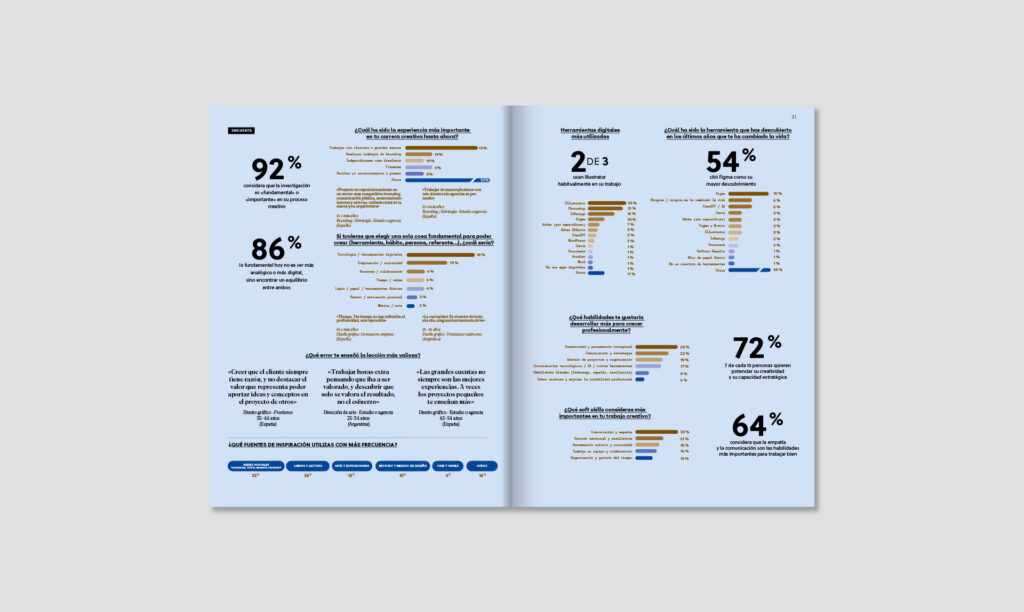 La revista se abre con una encuesta a nuestra comunidad de lectores. Un retrato de lo que muchos consideran esencial para mantener viva la creatividad: la curiosidad, la atención, la formación continua, la calma o la capacidad de asombro. Las respuestas, diversas y honestas, revelan que más allá de las herramientas, lo verdaderamente determinante es la actitud.