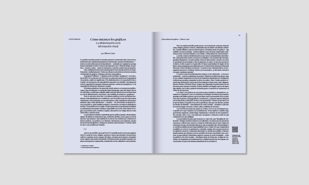 Este número se abre con un mapa de las diferentes formas de hacer infografía, una cartografía inicial para orientarse en un territorio diverso y en continua evolución. A partir de ahí, Alberto Cairo advierte de cómo los gráficos pueden mentir y defiende la alfabetización visual como una necesidad democrática. Miquel Baidal analiza el papel del color en la ilustración científica y su capacidad para construir realidad.
