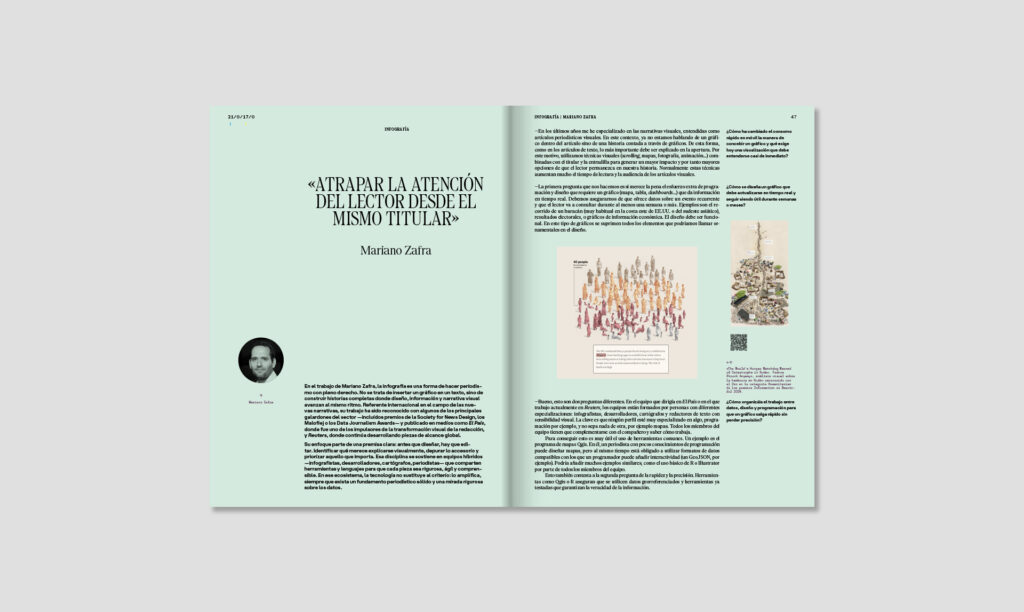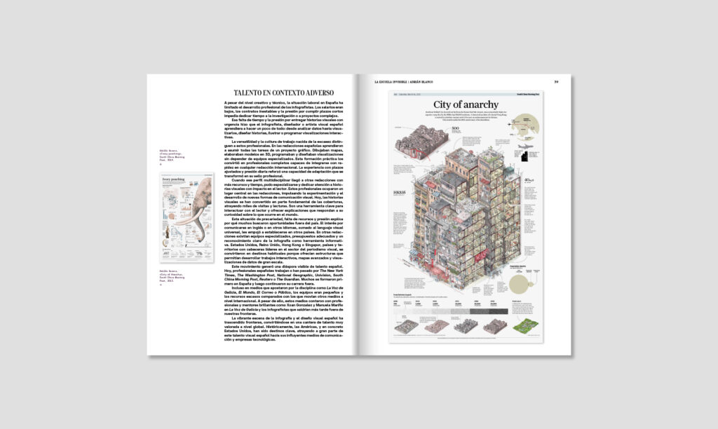 El reportaje La escuela invisible traza la historia de cómo los infografistas españoles han acabado trabajando en algunos de los principales medios internacionales, consolidando una forma de hacer basada en el rigor, la claridad y la narrativa visual. A este recorrido se suman entrevistas con profesionales como Mariano Zafra, Chiqui Esteban, Amaya Verde, Álvaro Valiño, Giorgia Lupi, Manuel Lima, Federica Fragapane, Marcin Ignac, Román García Mora o Francisco Javier González, que comparten miradas complementarias sobre cómo pensar, diseñar y explicar con imágenes.
