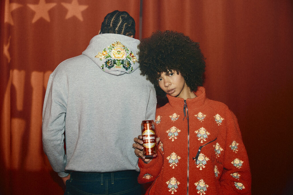 La colección toma como punto de partida el dibujo textil concebido por Cervera, un diseño que recoge algunos de los códigos visuales asociados a la indumentaria fallera y los traslada a una paleta dominada por los rojos intensos y los dorados. Ese lenguaje, originalmente aplicado a la etiqueta de la cerveza, pasa ahora a sudaderas, chaquetas, camisetas, calcetines y pañuelos en una colaboración con BLGR, marca nacida en Xirivella y vinculada a la cultura del drop y al ecosistema streetwear local.