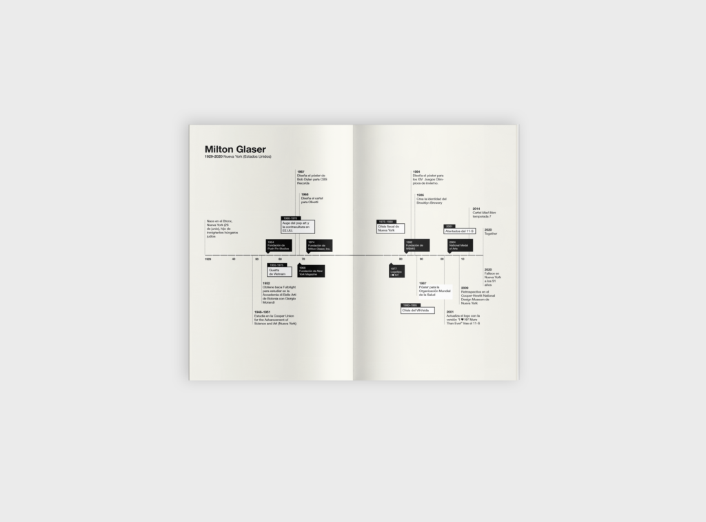 Durante más de dos años, Ortiz ha seguido el rastro del diseñador neoyorquino con una dedicación casi detectivesca: ha adquirido todos los libros sobre Glaser que ha podido encontrar, reconstruido su archivo visual y formado un auténtico “equipo de investigación” para acercarse a su legado. Su trabajo culmina con un testimonio inédito: una entrevista con el último jefe de estudio de Milton Glaser, que acompañó al maestro hasta el final de sus días y que revela detalles íntimos sobre su manera de trabajar, su pensamiento y los consejos que seguía transmitiendo.