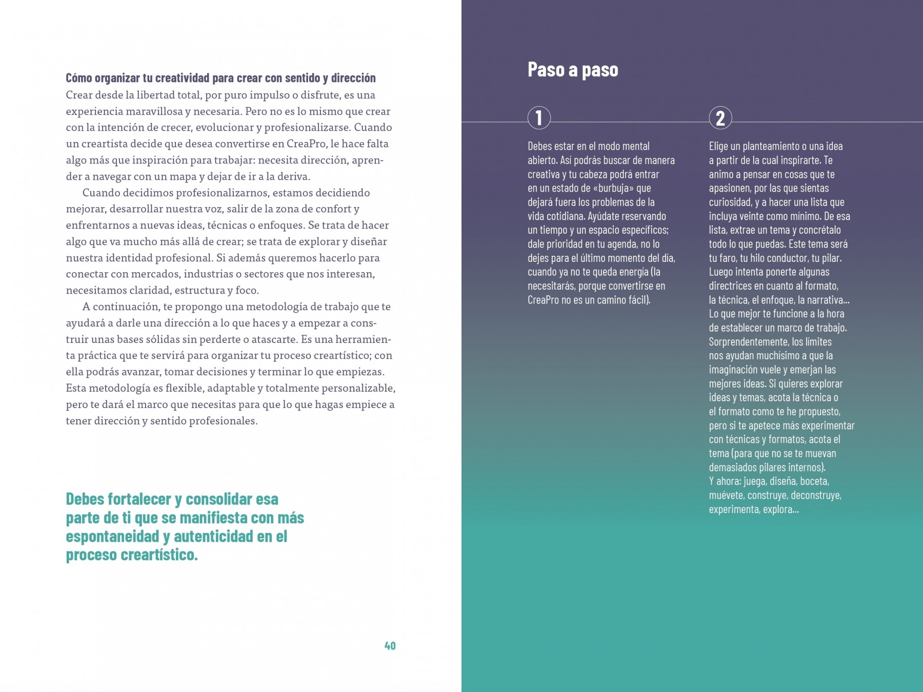 Un homenaje al inmenso valor que tienen la creatividad y el arte en el mundo. Una declaración de intenciones que te conecta con la esencia de lo que haces, con el poder transformador de tu mirada, tu sensibilidad y tu voz.» Convertir una pasión en profesión no es tarea fácil. Precisa cambiar patrones, transformar tu manera de pensar y de posicionarte respecto a tus impulsos creativos. Aprender. Tanto de ti mismo como del ecosistema profesional. Abrazar conceptos nuevos como «estrategia», «finanzas», «rentabilidad»; afinar otros como «imaginación», «perfeccionismo», «fortaleza». Tomar la decisión de vivir «de lo tuyo» abre un territorio que puede ser arduo y abrumador.