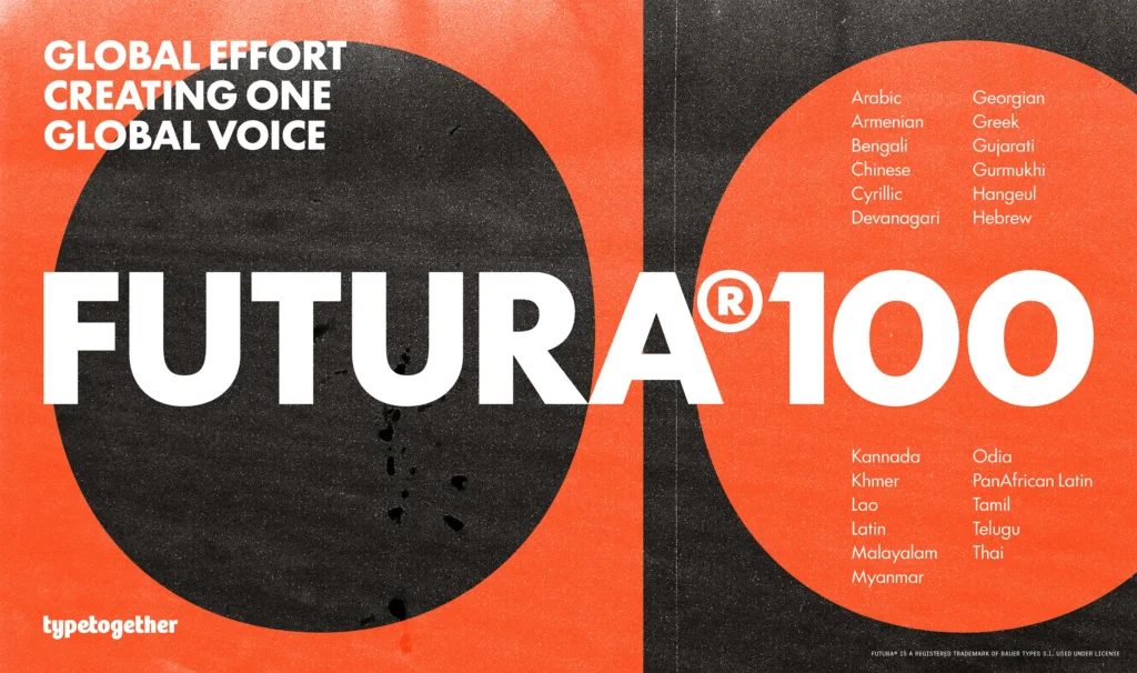 Por eso, TypeTogether ha puesto en pie un proyecto de enorme valor cultural y social. «Futura 100» da soporte a las lenguas habladas por más del 90% de la población mundial, respetando el espíritu geométrico del diseño original de Renner. En este primer lanzamiento se incluyen doce alfabetos o sistemas de escritura —armenio, cirílico, georgiano, griego, árabe, hebreo, jemer, lao, latín, latín panafricano, tailandés y birmano. Para el 2026, «Futura 100» se verá ampliada con 11 alfabetos adicionales que darán soporte a los principales sistemas de escritura índicos (devanagari, tamil, bengalí o telugu), así como con el chino simplificado y el hangeul (sistema de escritura coreano). En total, 23 sistemas de escritura que hacen de «Futura 100» una poderosísima herramienta para marcas globales que aspiran a conectar con una amplia variedad de públicos hablándoles en sus lenguas propias.